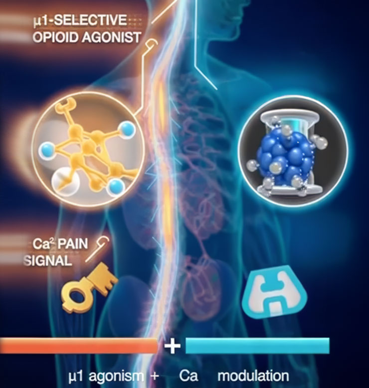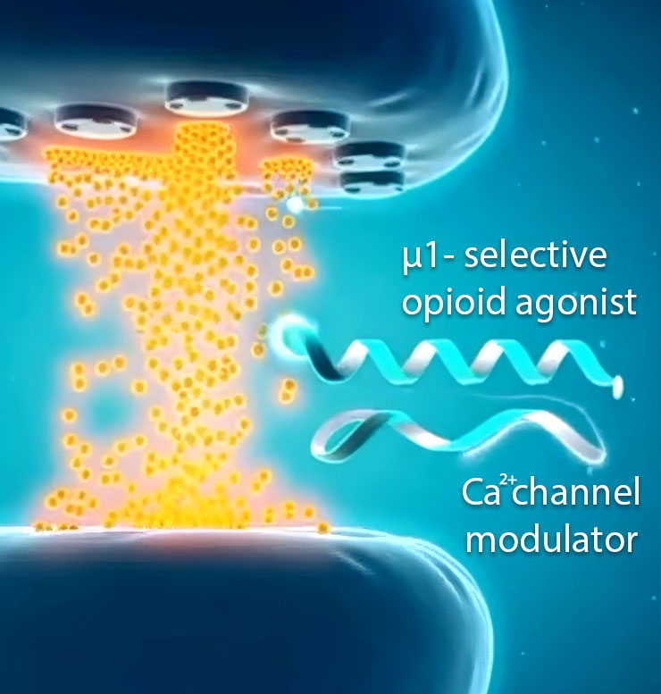 Revolutionary peptide technology Scroll down Innovative mechanism of action First-in-class dual-mechanism analgesic, non-addictive tetrapeptide. Unique Mechanism of Action Dual-Mechanism Analgesic: μ1 – Selective Opioid Agonist + Calcium Channel Modulator Highly selective μ1-opioid agonist A highly selective MOR1 agonist with minimal to no effect on MOR2, MOR3, KOR, or DOR. Non-Addictive Safety Profile Avoids all major opioid side effects: Addiction, Respiratory, Cardiac, Gastrointestinal. We lead and inspire modern peptide innovation to enhance human health. More about Taphalgin